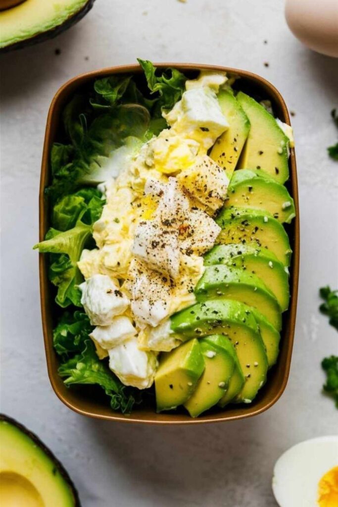 “A keto-friendly bento box featuring creamy avocado and egg salad served in small lettuce cups. The background is a bright, modern kitchen counter with natural lighting.”
