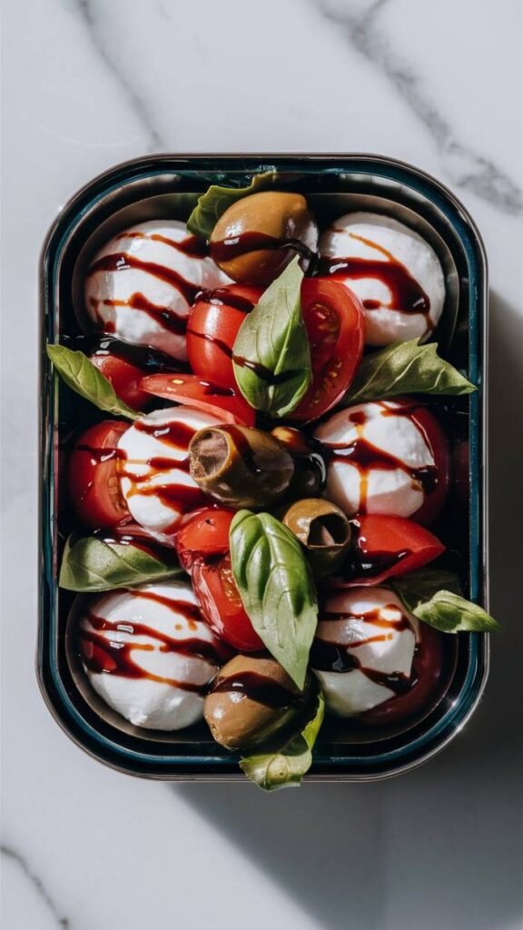 “A beautifully arranged keto Caprese salad bento featuring fresh cherry tomatoes, mozzarella balls, basil leaves, and Kalamata olives. The background is a clean wooden table with soft Mediterranean lighting.”