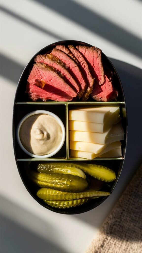 “A well-balanced keto bento box featuring roast beef and Swiss cheese roll-ups, a side of pickles, and a small container of mustard sauce. The background is a sleek white ceramic plate with warm lighting.”