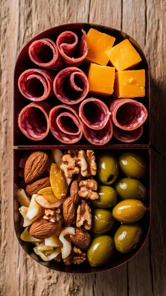 “A beautifully arranged keto charcuterie bento box with aged cheddar cubes, slices of salami, a handful of mixed nuts, and green olives. The background is a rustic wooden board with soft natural lighting.”